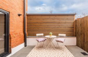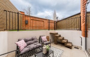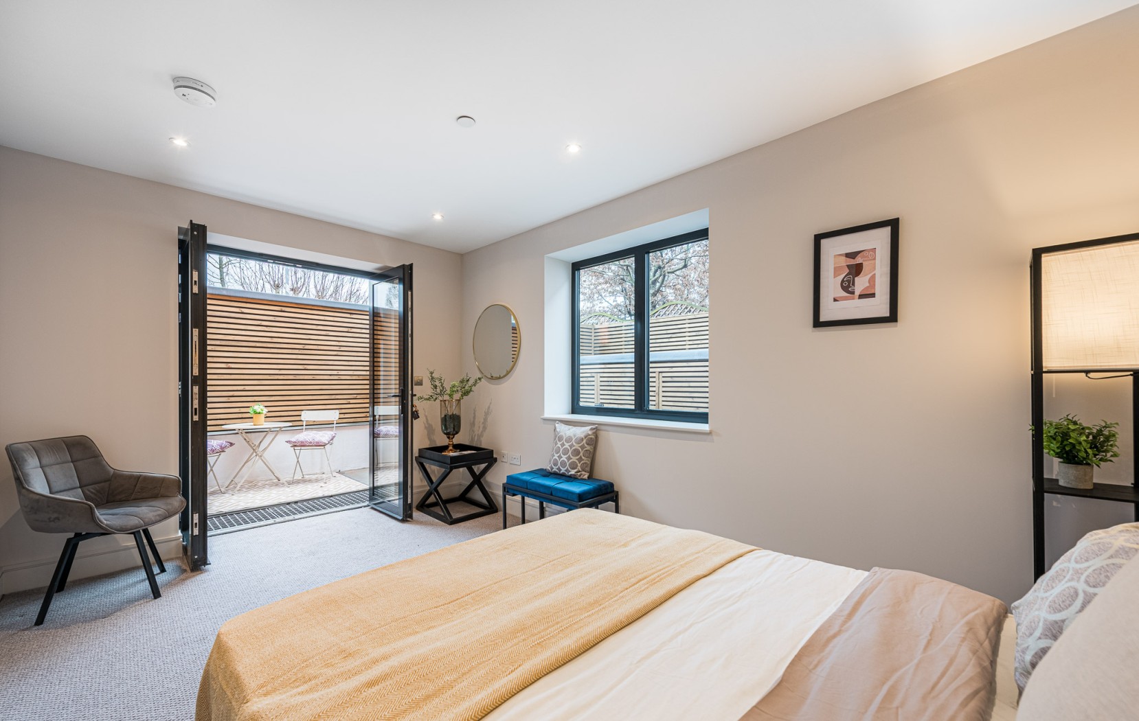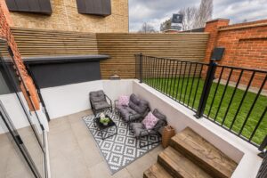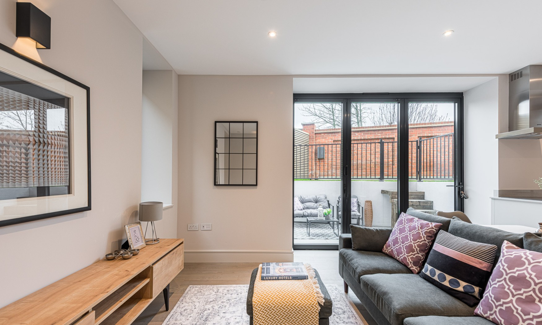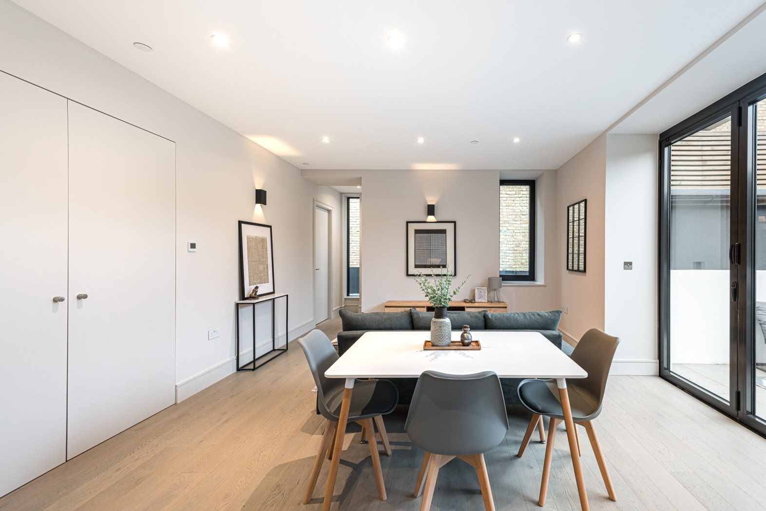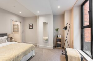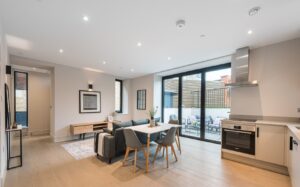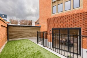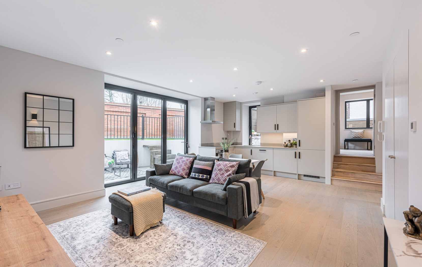 Located on the ground-floor corner of the striking St John’s Hall, this newly constructed 760 SqFt lateral apartment seamlessly blends contemporary luxury with historic charm. As you pass through the secure private entrance, you’re greeted by a generous and expansive open-plan kitchen and reception area serving as the true heart of the home. At one side, the bespoke kitchen boasts sleek cabinetry, integrated appliances and quartz worktops, providing an stylish space for cooking and dining. The reception area is bathed in natural light from sliding doors, which lead directly to your own private courtyard, ideal for al fresco entertaining or relaxation.