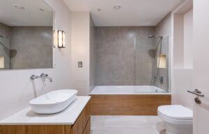 Two well-proportioned double bedrooms, positioned at either end of the apartment, benefit from large, light-filled windows and offer both privacy and comfort. A beautifully appointed family bathroom and en-suite bathroom are both finished with premium fixtures and a contemporary concrete-style palette, completes this exceptional home.