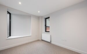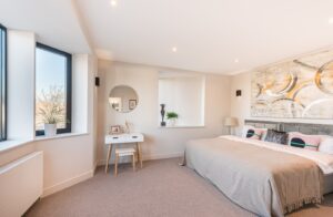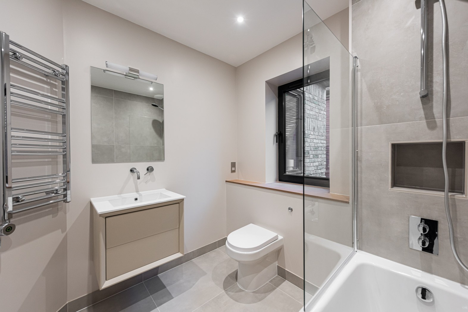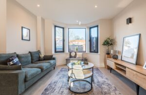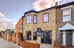The property boasts an impressive façade, featuring elegant brickwork and distinctive dark-framed windows, some with stylish protruding detailing. There is also the added benefit of dedicated external storage, ideal for bikes and outdoor equipment.