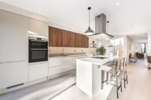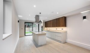 Upon entering, you are welcomed into an expansive double reception room with engineered oak flooring and excellent proportions, providing a versatile space for both entertaining and everyday relaxation. To the rear lies a bright and beautifully appointed kitchen and dining room, perfectly designed for modern living. This superb space benefits from engineered wood flooring and large bi-fold doors that flood the room with natural light and open directly onto the garden. The kitchen is fitted with extensive wall and base units, integrated Bosch appliances including fridge/freezer, dishwasher, oven and microwave, sleek quartz worktops, and a substantial central island that also serves as a breakfast bar.