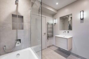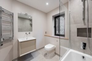 The first floor accommodates a generous principal bedroom at the front of the house, filled with natural light from a large bay window and offering ample space for storage. This room further benefits from a contemporary en-suite shower room finished with striking tiling. Two further well-proportioned double bedrooms are located to the rear, alongside a modern family bathroom featuring both a bath and a separate shower.