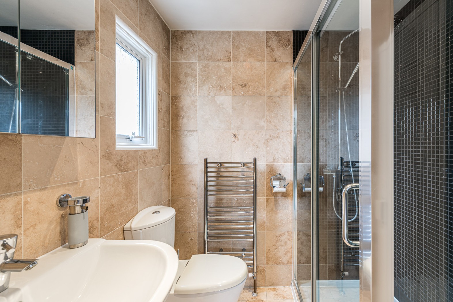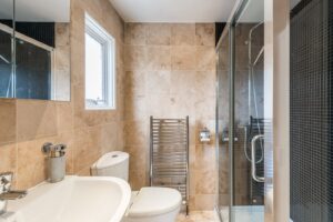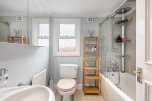 The first floor hosts the principal bedroom, a bright and generously sized double room with its own en-suite shower room, creating a private and comfortable upper-floor suite.