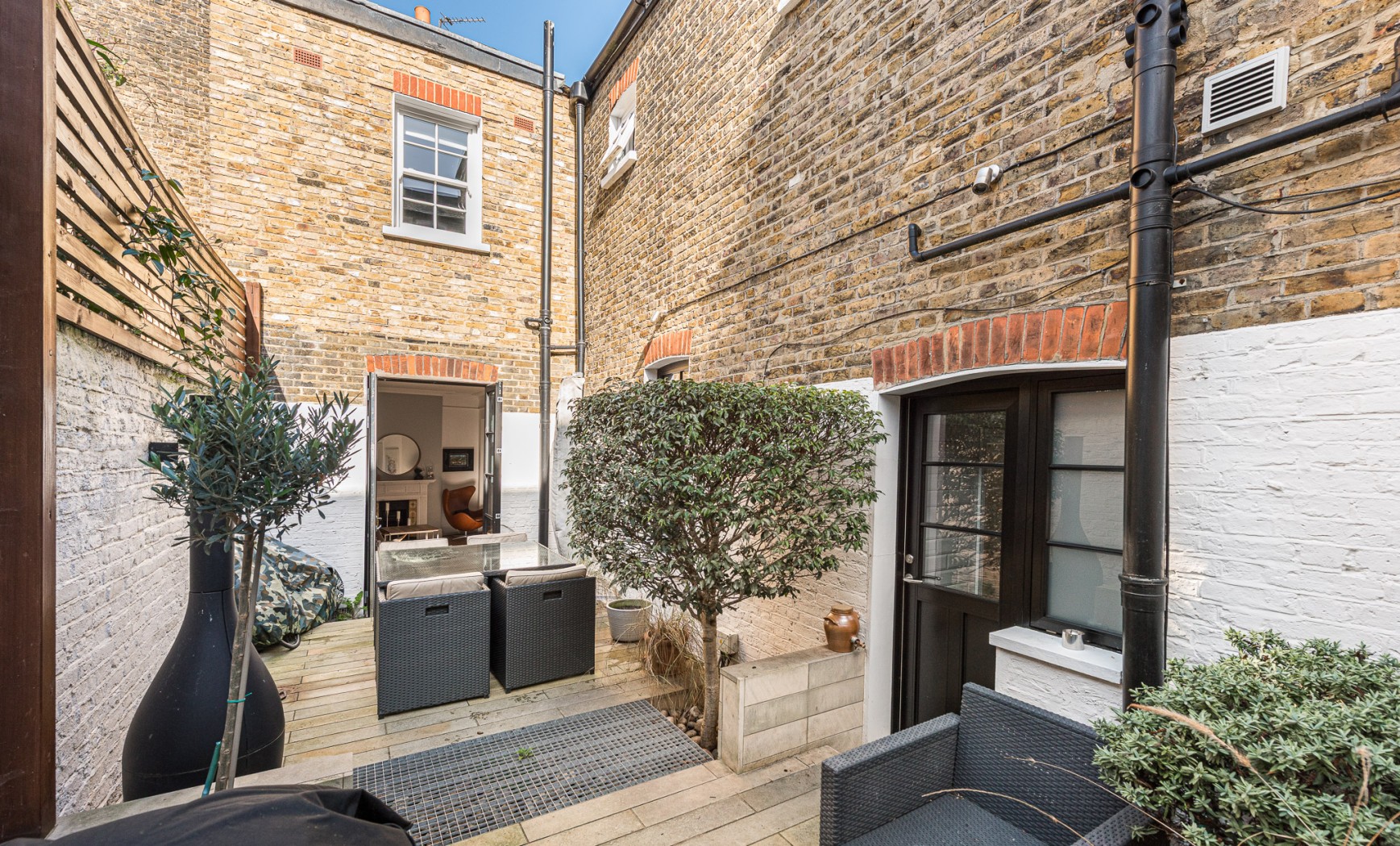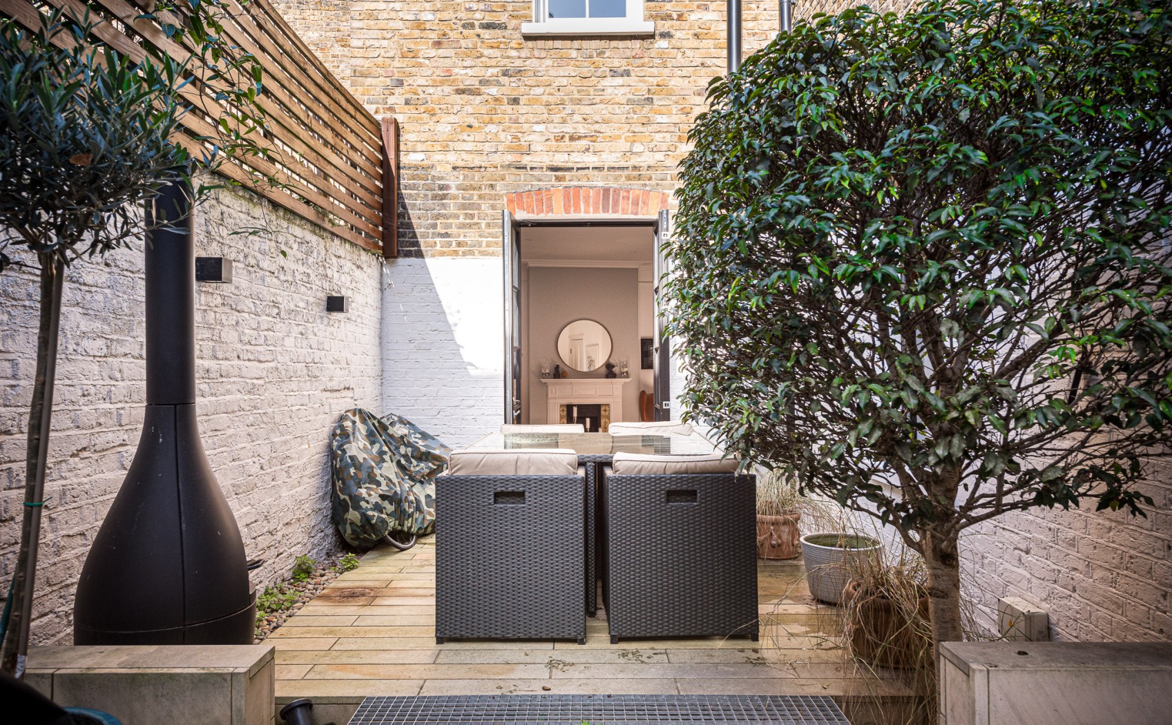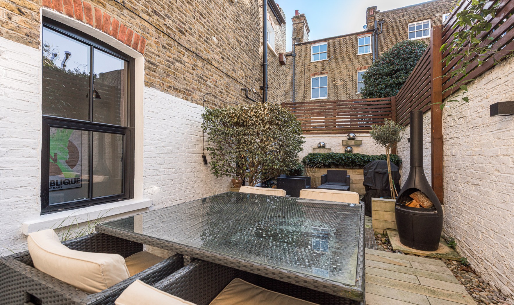 The south-facing garden is notably private and enjoys excellent natural light throughout the day, capturing sunshine from early afternoon onwards. It provides an ideal setting for outdoor lunches and evening dining and features a Morso garden fire chimney, perfect for entertaining during cooler evenings.