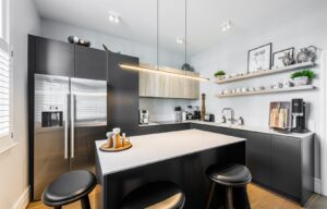 To the rear of the house is a beautifully designed kitchen and dining area. The bespoke Schmidt kitchen is finished with a striking Silestone Calacatta Gold worktop, complemented by a Grohe boiling water tap and integrated Liebherr wine fridge, creating a highly functional yet refined culinary space. The adjoining dining room overlooks the garden and offers an inviting setting for both casual meals and larger gatherings.