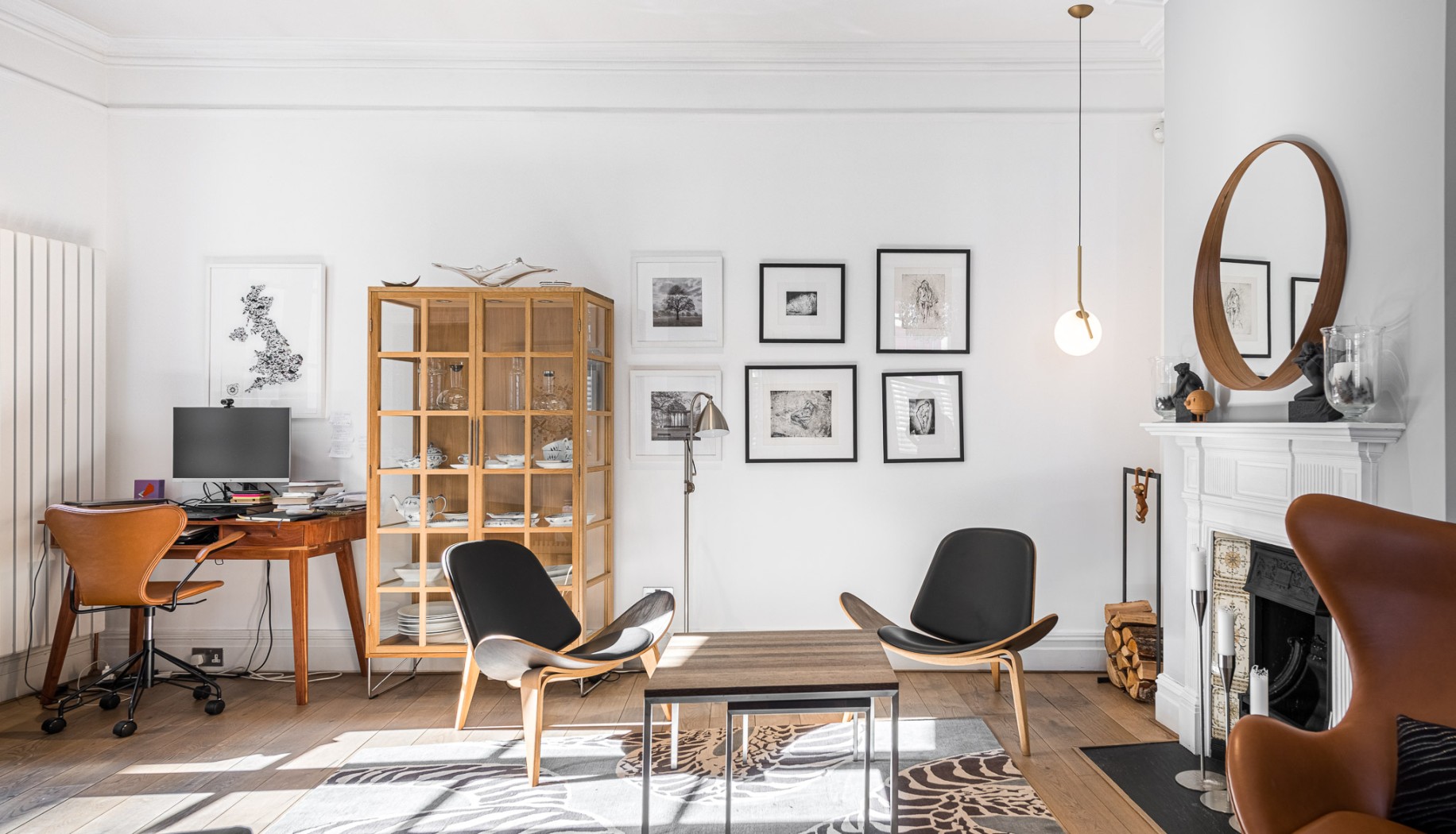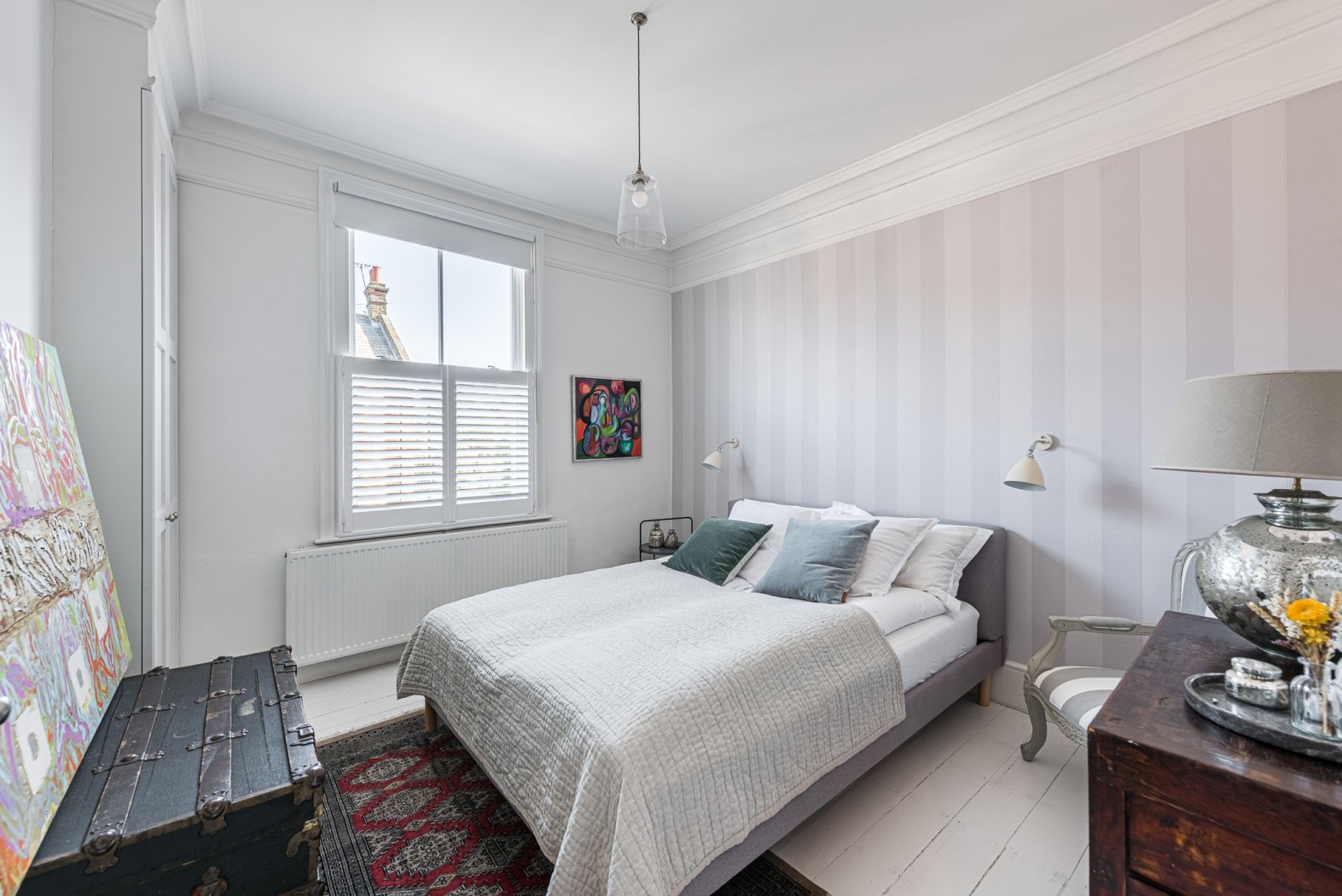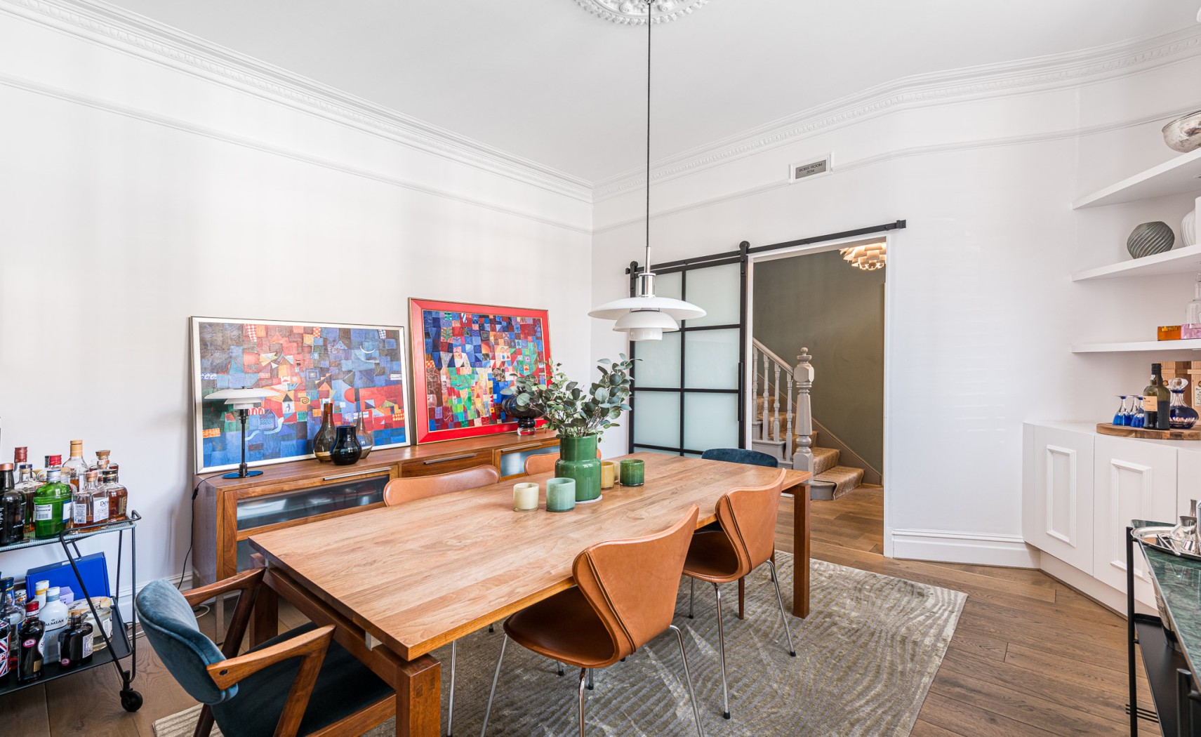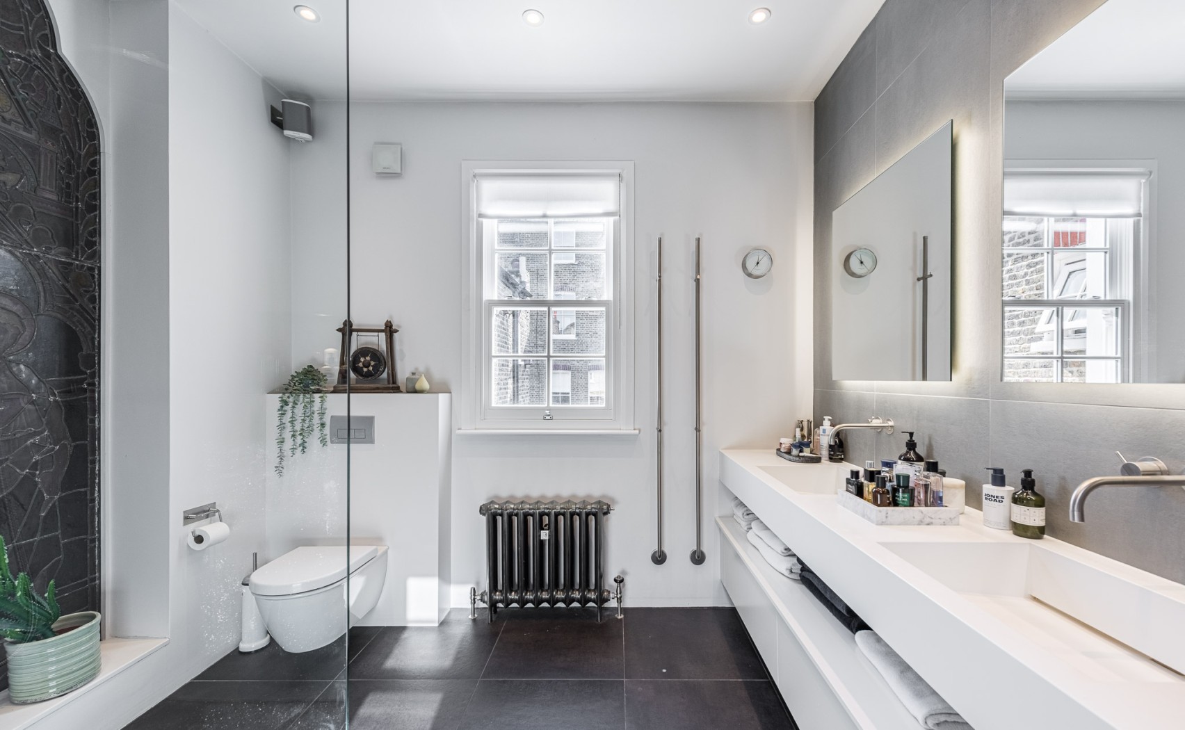 Upstairs, the first floor comprises three well-proportioned bedrooms. The principal bedroom sits to the front of the house and benefits from a dedicated dressing room. Two further bedrooms provide excellent guest accommodation or family living. The main bathroom is finished to an exceptional standard with Danish Vola fixtures, including integrated towel heaters, creating a clean and sophisticated space.