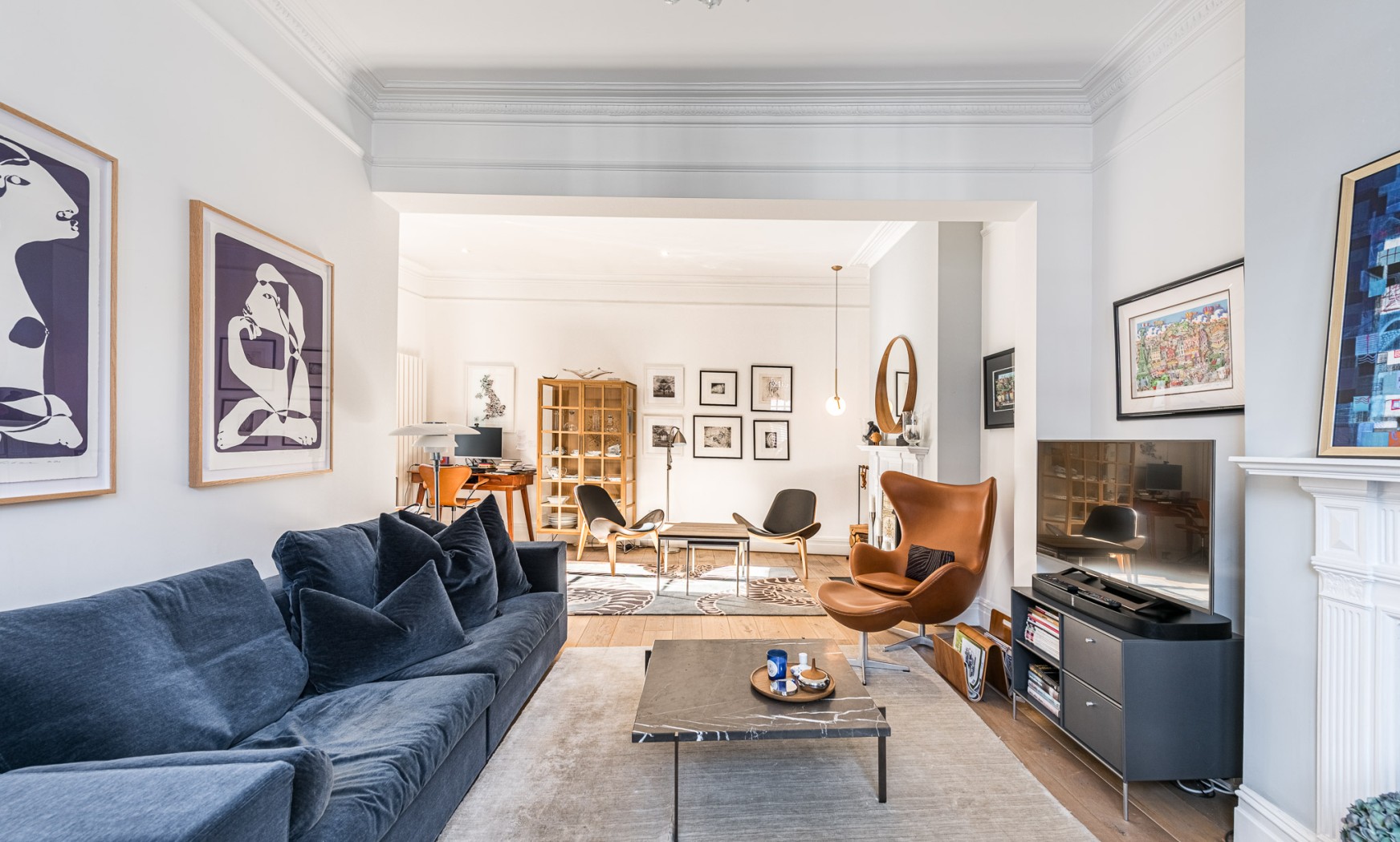 The ground floor opens into a welcoming entrance hall leading to an impressive double reception room extending over 24 feet in length. High ceilings, ornate cornicing, a feature fireplace and large sash windows create a wonderfully bright and elegant living space. The room flows naturally into a second seating area, ideal as a reading or conversation space, making the layout particularly well suited for both everyday living and entertaining.