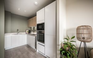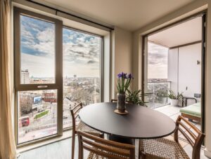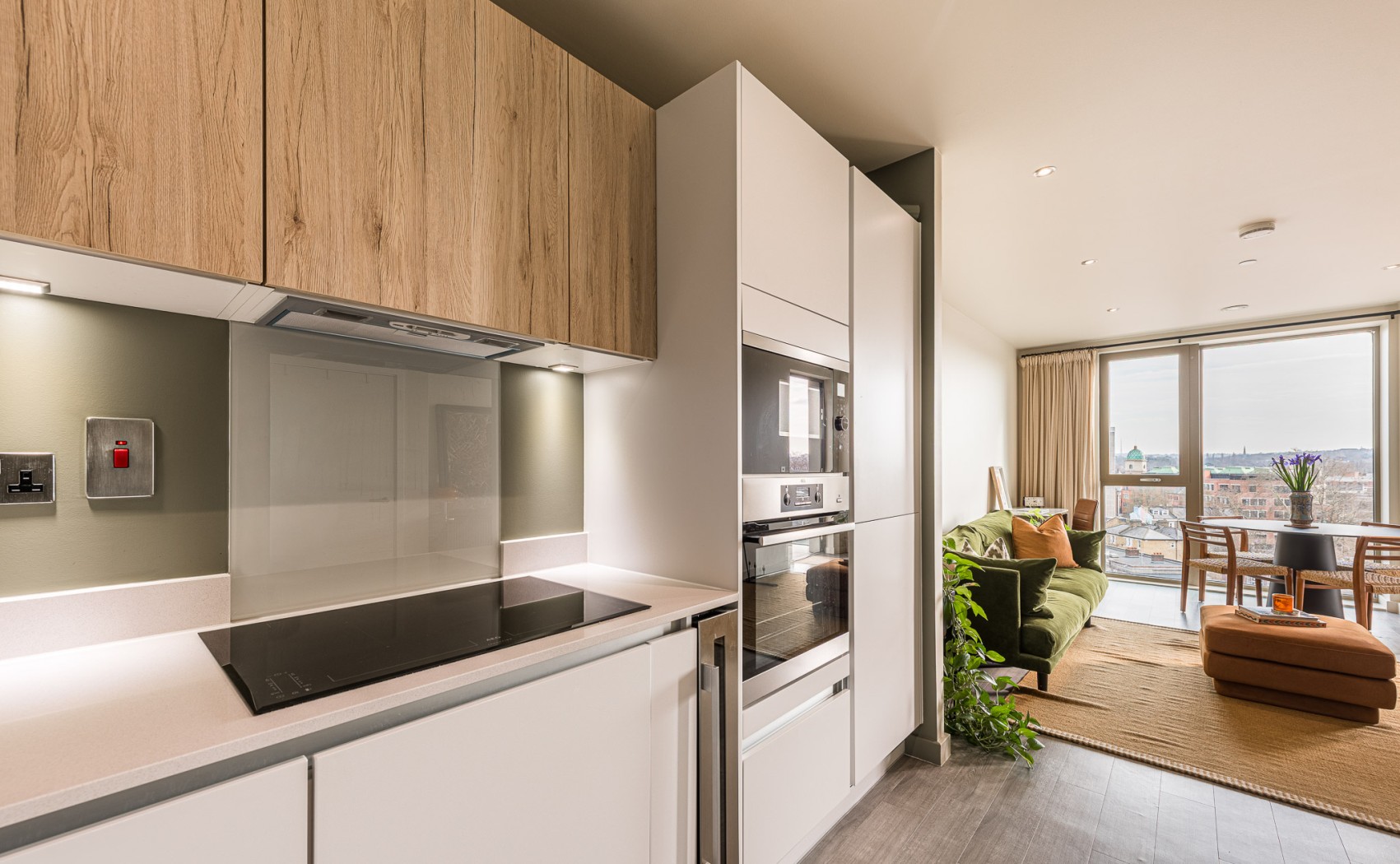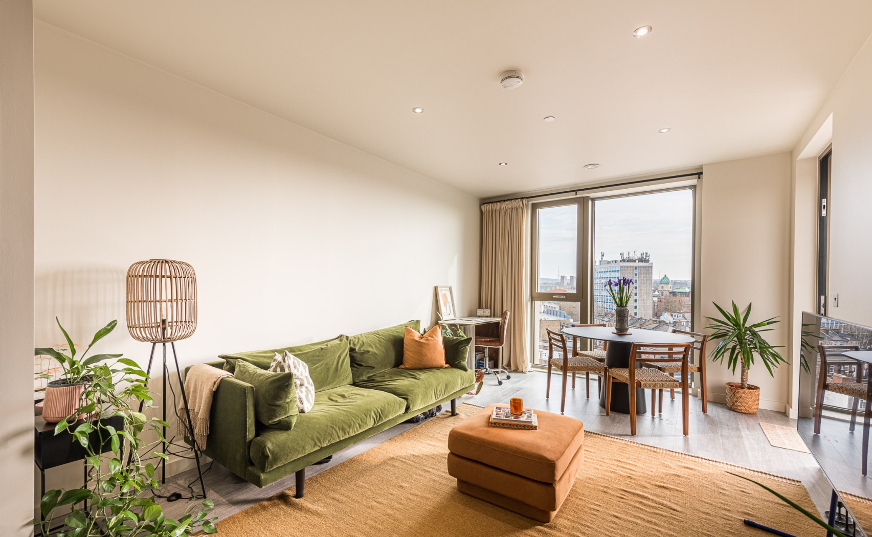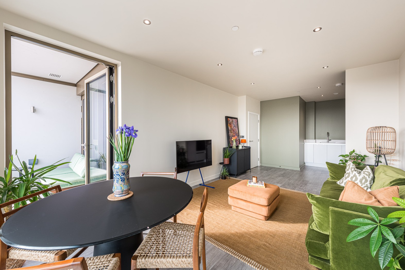 This stylish apartment features a spacious open-plan reception room and kitchen, designed for modern living and entertaining. The sleek kitchen is fully integrated with contemporary cabinetry and high-quality appliances, while the generous reception space benefits from large windows that flood the room with natural light and frame impressive city views.