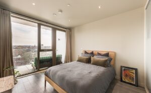 The well-proportioned double bedroom comes complete with fitted wardrobes and direct access to a private South-facing terrace - the perfect spot to enjoy morning coffee or evening sunsets overlooking the city.