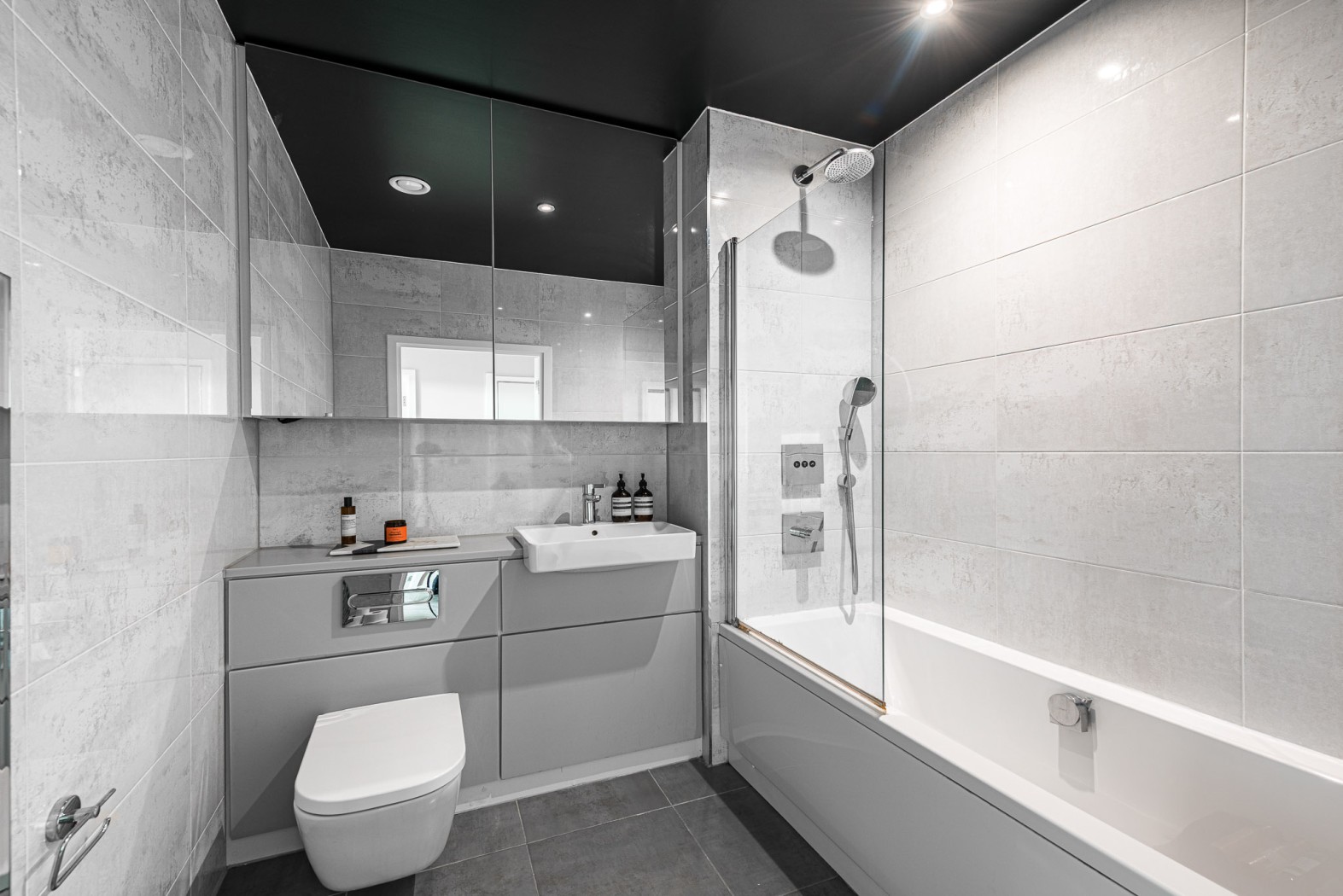 A modern bathroom suite is finished to a high standard, and the apartment further benefits from ample storage, floor-to-ceiling glazing, and a clean, contemporary interior throughout.